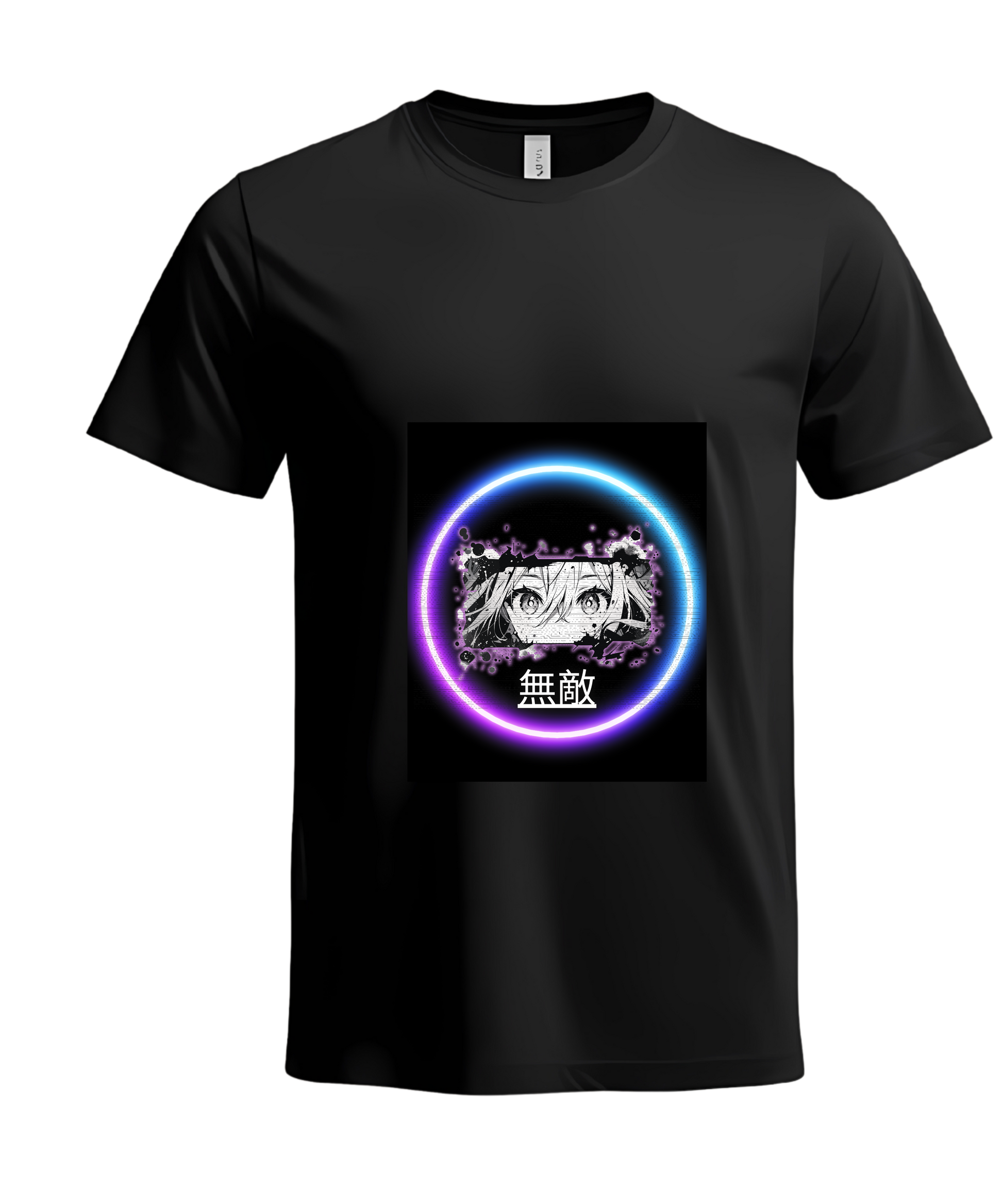 Front Design: Neon cyberpunk circle with anime-inspired artwork + Japanese Kanji text η‘ζ΅ (Invincible).